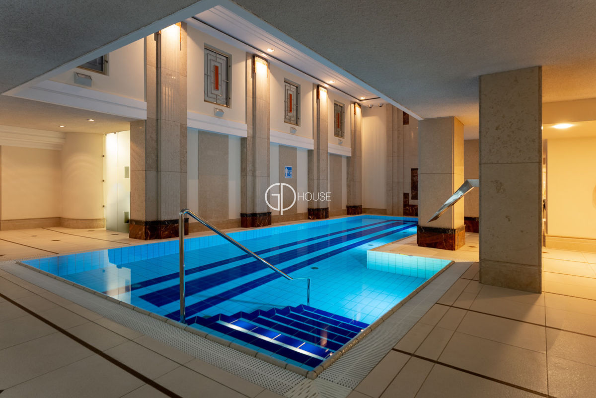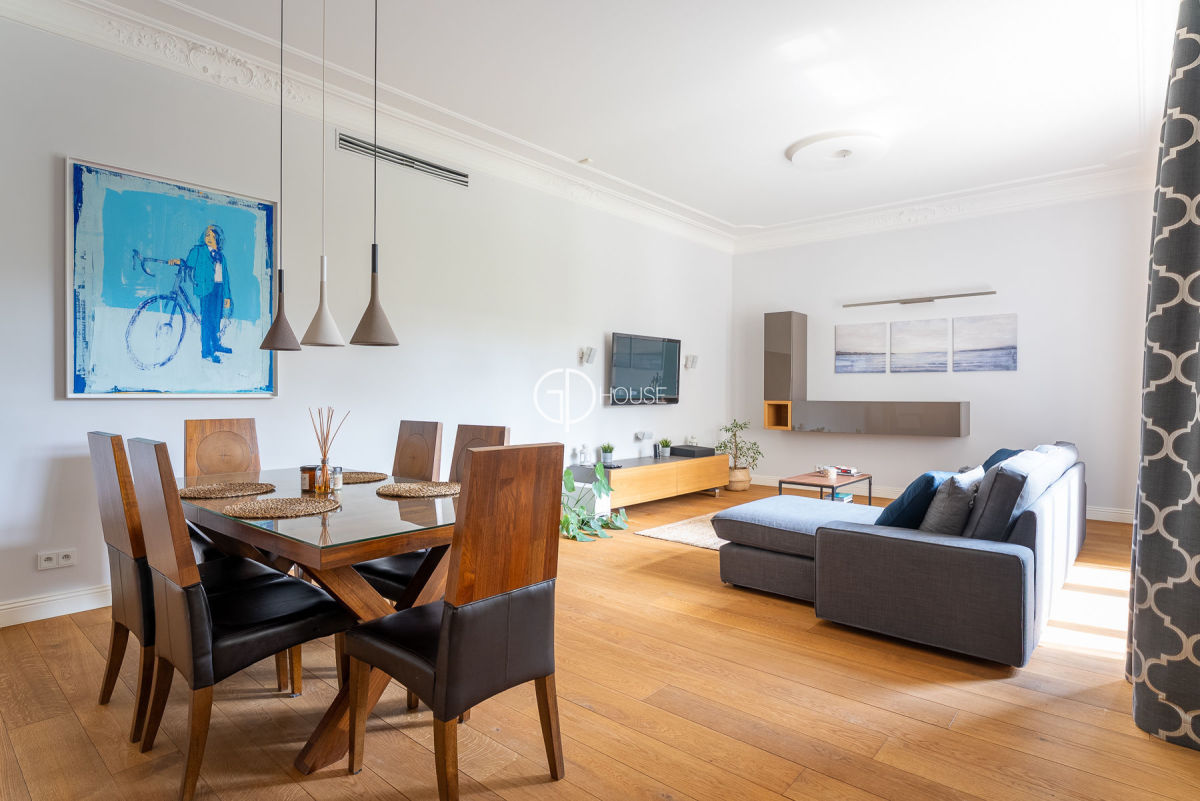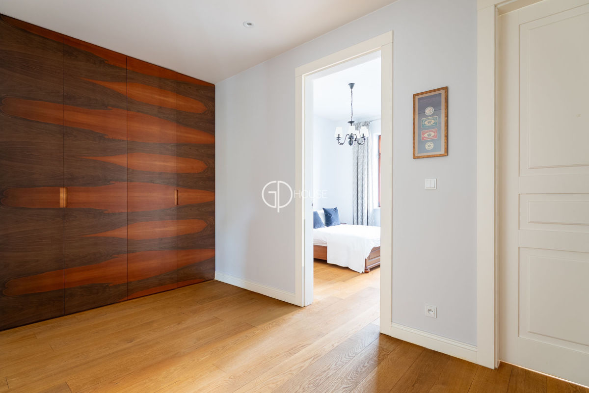 Mieszkanie składa się z: przestronnego salonu z otwartą kuchnią (umeblowaną i wyposażoną w sprzęt gaggenau), głównej sypialni z własną łazienką i garderobą, 2 dodatkowych sypialni, łazienki z wanną, toalety dla gości.