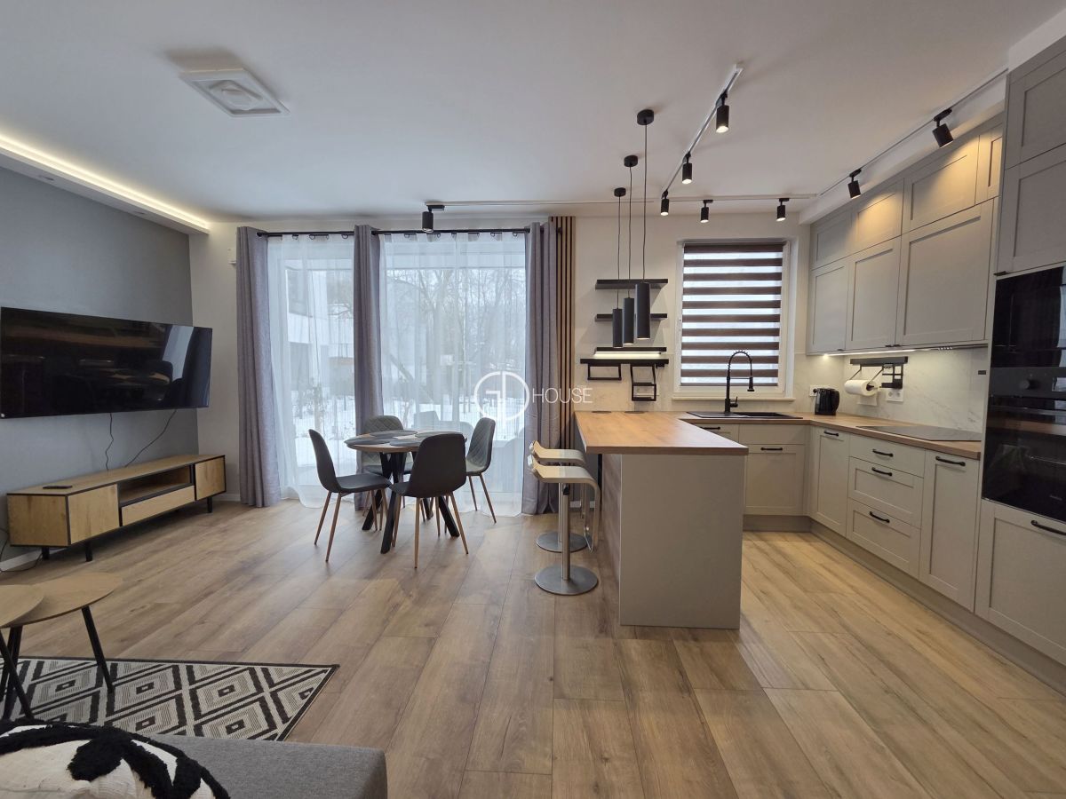 To nowoczesne i jasne mieszkanie znajduje się na parterze w niskim w dwupiętrowym budynku.
