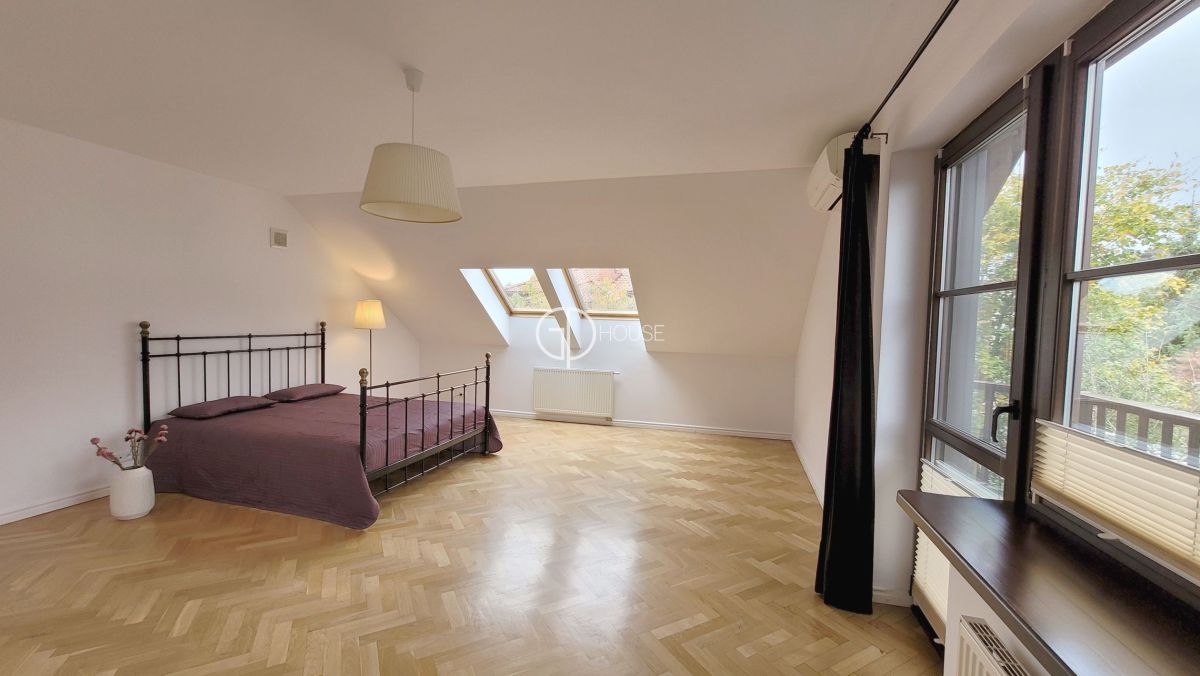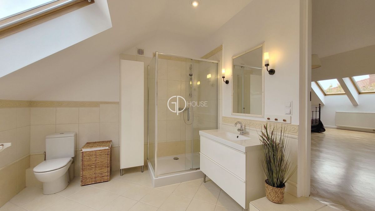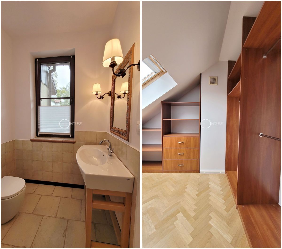 1 piętro: główna sypialnia z oddzielną łazienką (prysznic) i garderobą; 2 dodatkowe sypialnie, duża łazienka z wanną i prysznicem; druga garderoba.