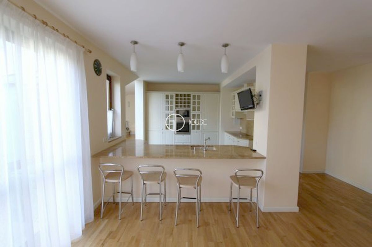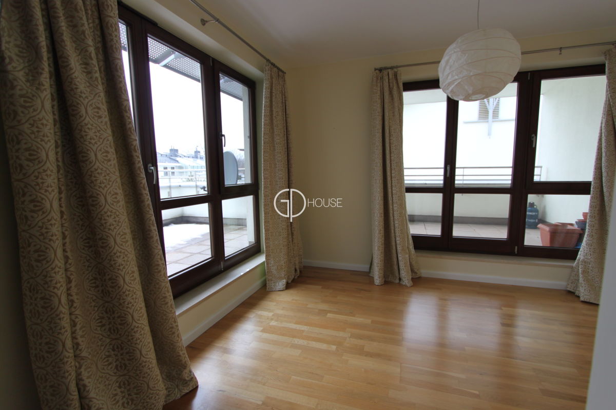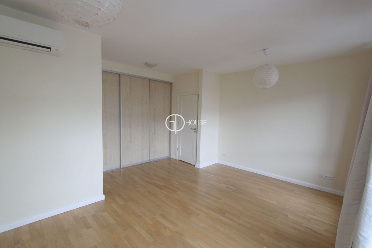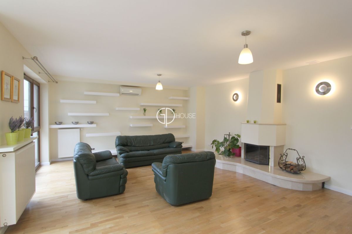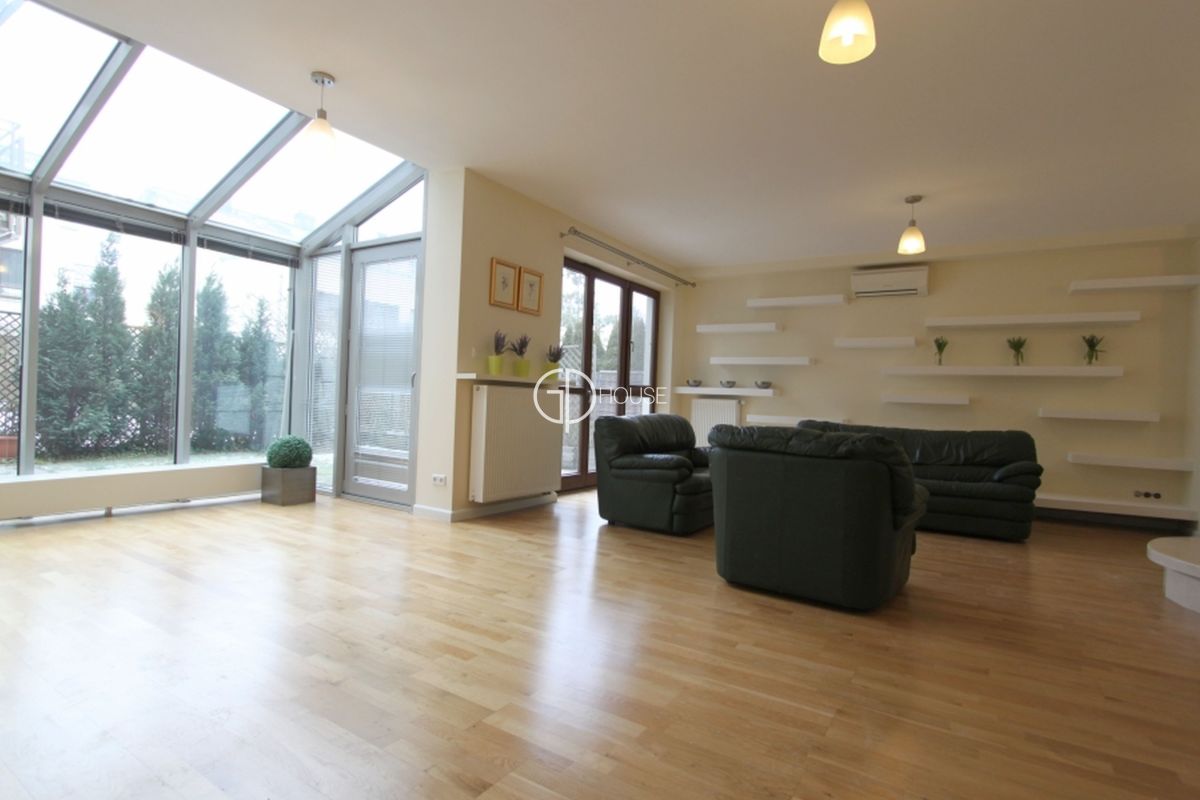 Semi-detached house located in the area of Wilanów, close to the castle and its park. 5 minutes from the international schools of Sadyba, close to cycle lanes going to the forest and close to the golf practice. New residence with security and reception, fitness and swimming pool (preferential rates to the fitness and swimming pool for the residents). Very good standard, the house can be rented furnished or not. Including: 1rst level : hall, livingroom with fireplace, opened kitchen on dining room, terrace, bathroom, laundry, large studyroom or tv room (can also suit for guests). 2nd level : 2 large bedrooms with bathrooms and 2 balconies, warderobe. 3rd level: master bedroom with bathroom and warderobe, terrace 25sq.m. 2 parking places in the underground garage of the residence. Location 5 minutes from the international schools. Rent + utilities (water, electricity, central heating and garbage).