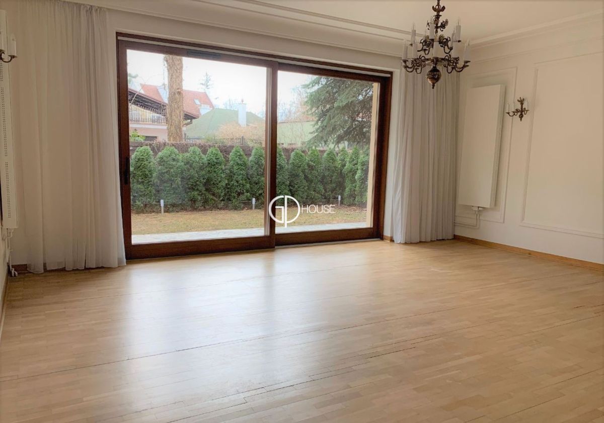 Semi-detached house located in the Sadyba area. The house has a very good standard. Lay out : hall, living-room (34sq.m.) with a fire place and direct access to a large terrace and to the garden, a separated kitchen with dining area and an additional dining room or study room, toilets. On the 1rst floor : 3 large bedrooms (23, 18, 17sq.m.) (the master bedroom having a wardrobe and access to a roof terrace), a bathroom and toilets separated. In the basement a large play room or guests room, a bathroom with shower, storage, laundry and garage. The house is equipped with alarm system and air conditioning and furnished. Very good location, walking distance to the Sadyba best mall, international schools, park, lake Czerniakowski, cycle lanes.