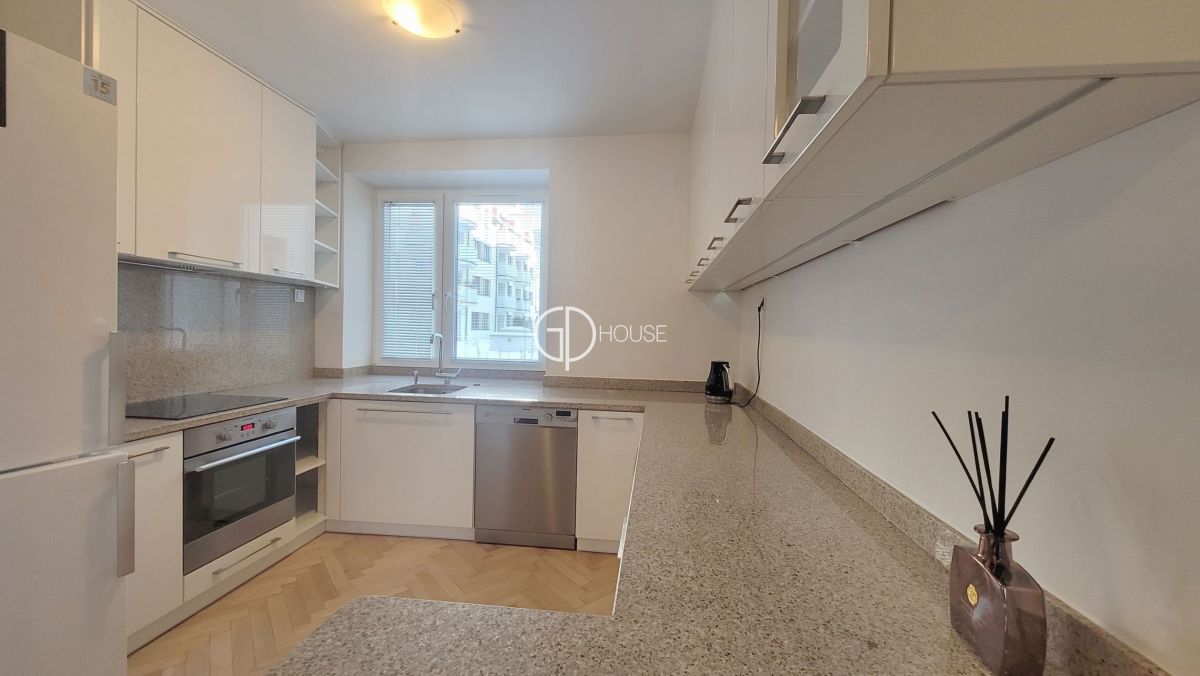 Flat located in the area of Sadyba, a few minutes by walk from the British and French school, from the Sadyba Best Mall, quiet and secured residence. The flat is on the ground floor, and includes a hall, a kitchen (10sq.m.), livingroom (25,5sq.m.), 3 bedrooms (26, 19,18 sq.m.), 2 bathrooms with washing machine and dryer.The flat is luminous, spacious and well located by walk from shops and schools. 1 parking place underground ans a storage.Rent + adminsitrative fee 2000 PLN + electricity and internet.